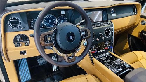 进口劳斯莱斯库里南全系标配激光大灯,夜间照射距离可达600多米,其造型也与幻影 (配置|询价)保持一致,眉”形日间行车灯上方,一条横向的线条贯穿而过,一展气度,前脸给人庄重威严之感。车身线条饱满,其C柱与D柱之间的舷窗较大,这种设计会给后排预留更多的空间。在车身尺寸上,全新库里南的长宽高分别为5341/2164/1835mm,轴距长达3295mm,转弯半径为13.23m。