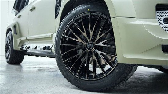 这款基于路虎卫士定制的虏曼挑战者轮胎配件可按照自己的心意自由选择,搭配19至23寸加大轮圈全地形轮胎,与CLR Racing越野胎或者公路胎组合,更加宽大的轮眉使得两侧车身宽度各增加40mm,车身高度也增加了30mm,令整车的越野气质得到了进一步提升。
