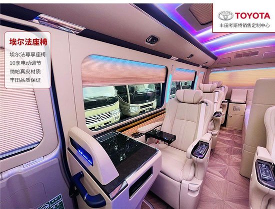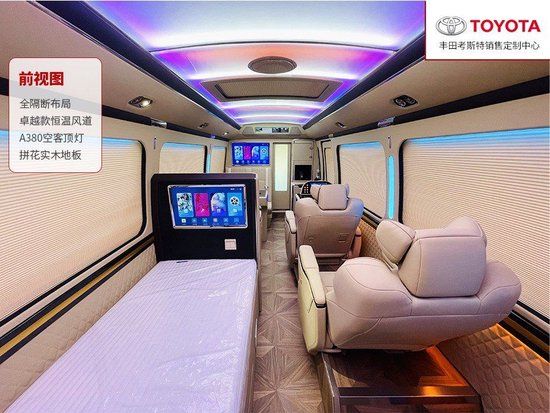 丰田考斯特改装座椅,可以根据自己的选择上可以根据自己的选择定制,真皮座椅,豪华航空座椅都可以根据自己的选择进行改装同时还可以安装沙发床,方便我们在旅途中的休息。不会惧怕和任何商务车的对比。在内饰改装上车内窗帘的的选择上就有多种方案,豪华的布艺窗帘以及自动的百褶窗帘都在我们的选择范围内。随心的定制是其他任何商务车都无法企及的。