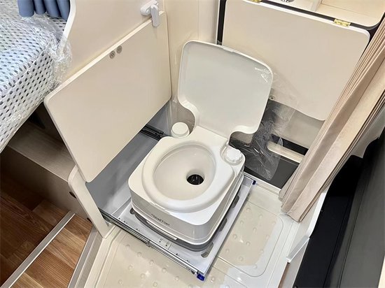 卫生间区域也发生了变化,采用了简易卫生间的设计,不仅可以增大厨房区和卫生间的使用面积,而且也便于卫生间的清理打扫。内部还配备了洗手盆、卫生间、淋浴等设备,满足车友基本洗漱需求。水电配置方面,本车标配75L清水箱、40L灰水箱、460Ah锂电池、12V底置空调及伟巴斯特燃油暖风热水一体机等。