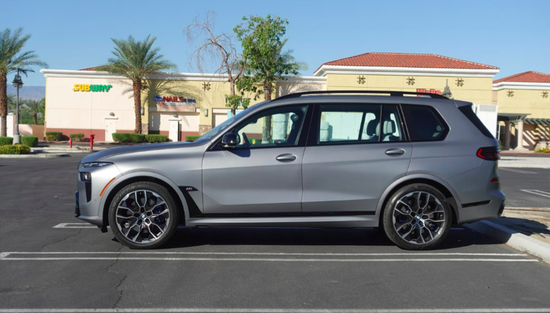 新款宝马X7 M60i侧面也是延续普通版车型设计风格,结合空气动力学原理,以修长流畅的线条打造,能够较好降低行车时风阻系数,改善驾驶体验感。车顶行李架很是抢眼,其采用镂空式结构,承载能力得到扩展,此外其还和外后视镜、门边框一道,以高亮黑材质覆盖,加之侧裙处黑化饰件,运动气息更为浓郁。22英寸五辐式轮毂尺寸突出,同时还匹配少见的蓝色四活塞刹车卡钳。