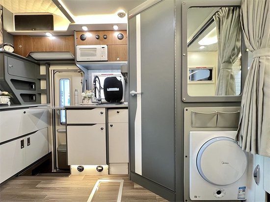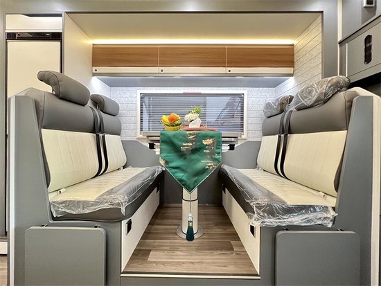 车厢内高为2020mm,高个人群进入车内完全不用担心有碰头的风险。内饰采用免漆家具板+进口地板革+防火板台面等,保障内部高品质的居住使用空间。本车内部安装有房车智能APP控制系统,实现房车的智能使用。车主可通过房车智能APP,对车内的电器进行远程遥控,在房车中实现也可智能家居。