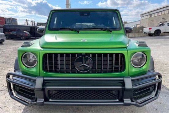 新款奔驰G级AMG G (配置|询价) 63魔焰绿作为年度改款车型,在外观方面基本没什么变化,延续了老款的外观设计,整体造型依旧硬朗气息十足。车头部AMG家族的设计风格,带有镀铬垂直的格栅饰条,加上两侧圆形大灯和中间标志性品牌logo,使其辨识度超高。此外,新款奔驰G级AMG G63在下包围部分采用硬朗十足的设计风格,三段式前保险杠,辅以镀铬饰板进行设计,使其运动感十足。