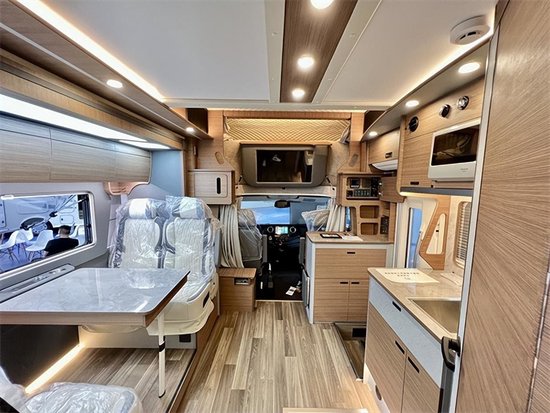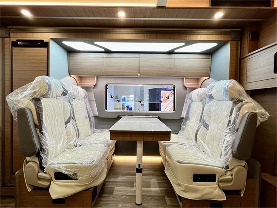 车内采用三菱的1.5P直流变频静音节能空调和伟巴斯特的进口驻车燃油暖风,方便驻车使用。还配备卡洛西进口行车冷风,增加驾驶的舒适度,为长途旅行奠定基础。车内采用中式的家居风格,棕色木纹加米色木纹的装饰,沉稳内敛符合大多数人的审美风格,会客厅部分采用的是对座式沙发卡座的设计,直径达到了1.95m,即便两个成年人对立而坐也不会碰腿。升降桌降下与对坐沙发可以拼成一张1900*945(mm)的临时床位。