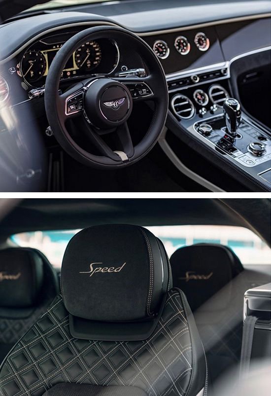 内饰方面,新车大面积采用了黑色装饰,内部配有三幅式多功能方向盘、3个指针式仪表盘以及电子挡把,同时还大面积采用了碳纤维材质和Alcantara材质覆盖包裹,并且头枕位置有刺绣“Speed”标识,彰显出内饰的豪华感,其中运用少量的金属加以点缀。