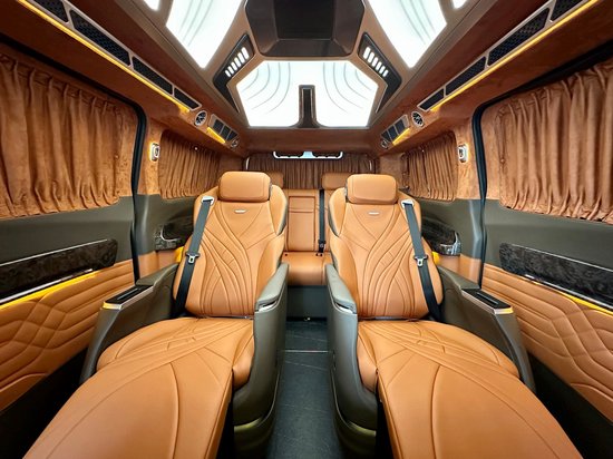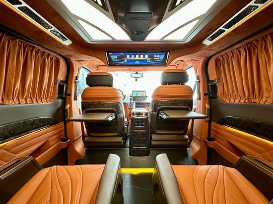 驾驶舱采用NAPPA头层牛皮+碳纤维搭配双拼,仪表台采用的是法式双缝线的设计。中央扶手带有制冷冰箱,支持零下12度到10 度的温度调节,夏天可以随时有冷饮,一些食物也可以临时冷鲜储存。全隐私的双层窗帘。影音系统搭载VVCAR 9.1声道立体环绕音响,打造身临其境的视听环境。