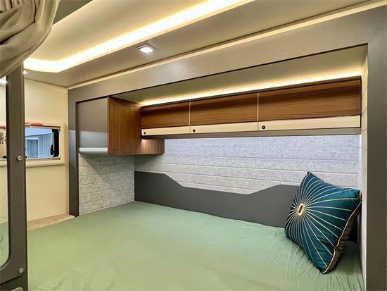 车尾主卧横置床完全拓出后尺寸更宽敞,尺寸为:2.1x1.3米,轻松睡下两名成年人,两侧外推窗形成良好的空气流通循环,采光效果也更佳,顶部吊柜上安装有一圈氛围灯带,暖黄色灯源尽显温馨。