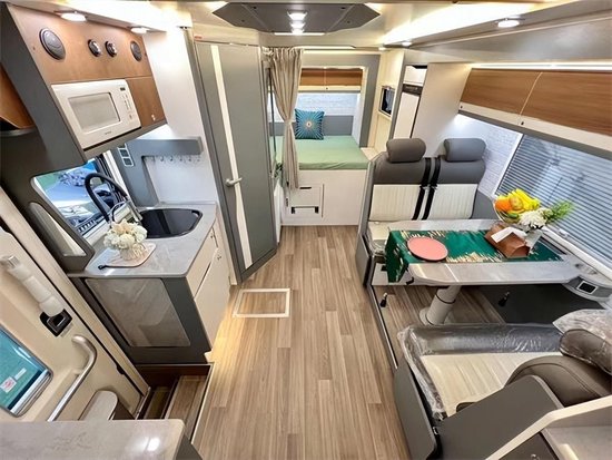 车厢内高度为2020mm,内部尺寸宽阔,高个人群进入车内完全不用担心有碰头的风险。内饰采用欧洲工艺家具设计,整体选用免漆家具板+进口地板革+防火板台面等,保障内部高品质的居住使用空间。还有一点值得说道,本车内部安装有房车智能APP控制系统,实现房车的智能使用。车主可通过房车智能APP,对车内的电器进行远程遥控,在房车中实现也可智能家居。