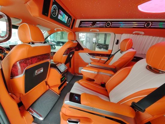 乘客舱电动窗帘与整车内饰非常搭,并且可以很好的保护乘坐者的隐私,避免外界干扰,防晒、遮光都不错。迈巴赫航空座椅,具有多项智能调节功能,可启动,高低,前后调节,头枕,腰托,脚托,按摩,通风,加热等功能。还可以360°旋转,与后排形成一个小的会议室或者是娱乐室。后排沙发座椅能三座变两座,180°平放变成一张双人沙发床,刘经理15222407919《同微信》为您的长途行程提供充足的睡眠。 车内LED迈巴赫云格顶灯,氛围灯,让您身处在乘客舱内体验,浪漫气息氛围感满满。