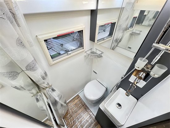 尾部休息区横置一张大尺寸床铺,拓展后空间更宽敞,可以满足多人睡眠休息;床铺车窗、隐私帘、照明灯、电源插座等设施配备齐全,带来舒适贴心的睡眠体验;顶部是一排储物吊柜,侧面还有一个按压式储物柜。卫浴间内部基调与生活区保持一致,实木地板、大理石纹台面起到了带动氛围的作用。配置上,卫浴间提供游艇陶瓷电动粉碎马桶、陶瓷洗手池、化妆镜、淋浴花洒等。卫浴间还提供1500W 6.6L电热水器作为热水供应。水电配备300L净水箱、45L灰水箱、80L黑水箱、48V 250Ah锂电、48V 4000VA充逆变一体器、1200W硬板太阳能供电系统等,解决了户外旅行水电的问题。总体来看,戴德新款E途SE房车的各方面表现都非常出色,车型的亮点也非常突出,尾部的超大户外厨房、车内会客厅的可拓展设计和尾床下方的折叠式踏步,设计实用方便,让旅行生活更贴心舒适。