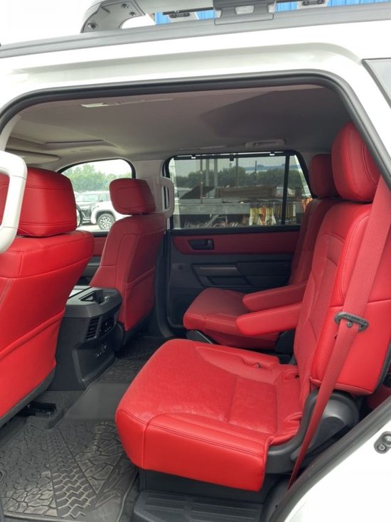丰田红杉内饰的实用性与空间利用率在这代红杉身上均得到提升,坐进车内,第一感受就是大,前排的两个大尺寸的真皮座椅,自带打孔透气皮料,四幅式多功能方向盘,握在手里的质感不错。