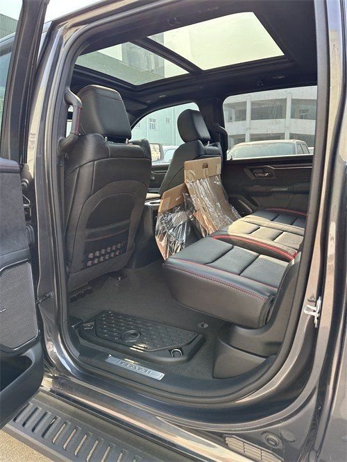 从内饰上看,它也毫不逊色。中控部分配备了12英寸竖置中控屏幕,屏幕一横加一竖,按键很齐全,档把也是彰显霸气,手小的可真是不好握,随处可见TRX标识,这样一个庞然大物内饰也是十分潮流的。