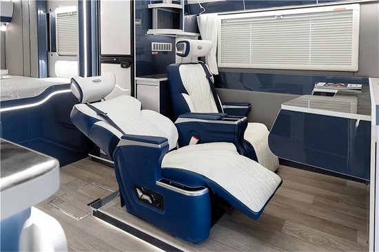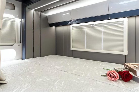 内部大量采用高亮度的家具板材,加上高级灰的装饰,内饰颇显干净利落。在布局和表现形式上,不同的是原车在拓展机构内只配备了两个航空座椅,搭配了一款舒适的工作台,未来也可能作为选配项目。车尾拓展床位区域在入口处特意设计成了切角的正方形,通过车内的灯带和线条拉伸车内的视觉空间和线条带来的美感。