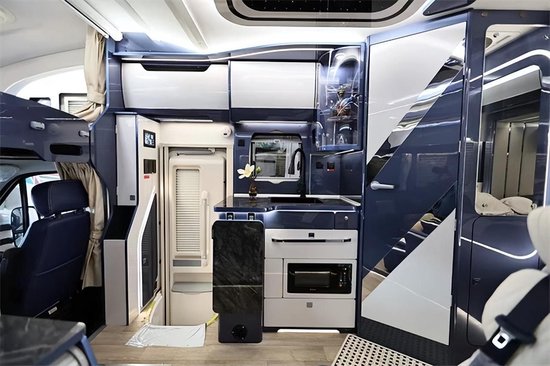 厨房区操作台面,放置了不锈钢水盆、高弯抽拉水龙头和台上式电陶炉 ,大宇15L微波炉、3kg烘干洗衣机和英得尔152L冰箱 。48V电路系统,包括48V 235AH 磷酸铁锂电池、710W太阳能板、6000W逆变器、埃贝赫12Kw燃油加热器-暖风热水系统 、5.2kw暖风机、房车专用隔膜水泵-带前置过滤器!