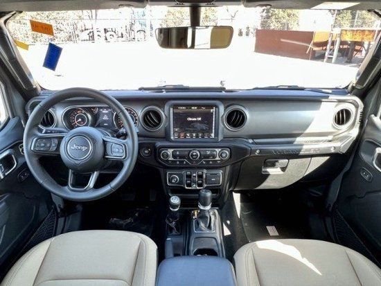 2022款吉普牧马人内饰采用双色设计,采用三幅式多功能方向盘设计,配备双圆形机械仪表盘,中控台配备内嵌式触摸屏设计,下方保留了大量实体按键。2022款吉普牧马人入门版配备7英寸信息娱乐系统显示屏,高配版8.4英寸内嵌式触摸屏,集成地图导航功能。