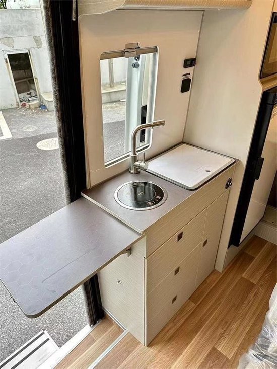 新款启界R600的内饰布局采用单排座椅卡座和后横床的布局,厨房和卫生间分布在中间区域的两侧。厨房功能区域由之前的85L房车专用冰箱升级为118升冰箱,微波炉、电磁炉、高位水龙头及洗菜池等常规设备得以保留,侧面带有翻折的扩展操作台,能够扩大厨房区域的操作面积。