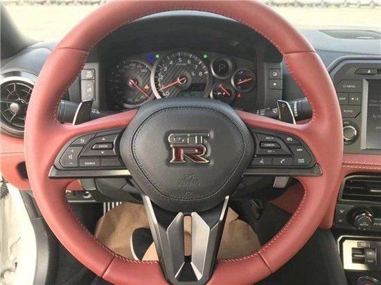 23款日产GTR三辐式方向盘采用全新样式的设计,相比老款时尚了不少,大小和粗细适中,握起来手感舒适,丰富的多功能按键可分别控制行车电脑,与定速巡航等信息。换挡拨片设计在方向盘上,可随其转动更利于操作,比之前固定在转向柱的设计好太多。
