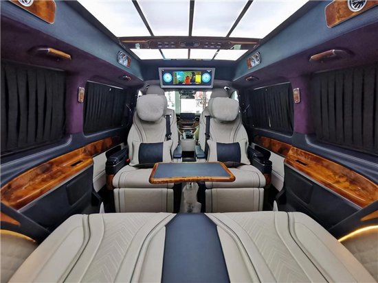 第三排采用的是一个三连排的电动沙发床,可以一键180度平躺,如果将旋转过后的座椅腿托升起,即可立马组成两米长的大床。全车配备了窗帘,既可以保证车内日常的隐私性,也可以阻挡阳光的直接照射,不管白天还是晚上,都可以休息得非常好。整车内饰的风格布局,颜色搭配协调,稳重的同时不失优雅,高端的雀眼枫木作为木件装饰,提升整车质感,显得与众不同。整车也做了多层的隔音止震保暖等处理,进一步提升了隐秘性以及舒适性。