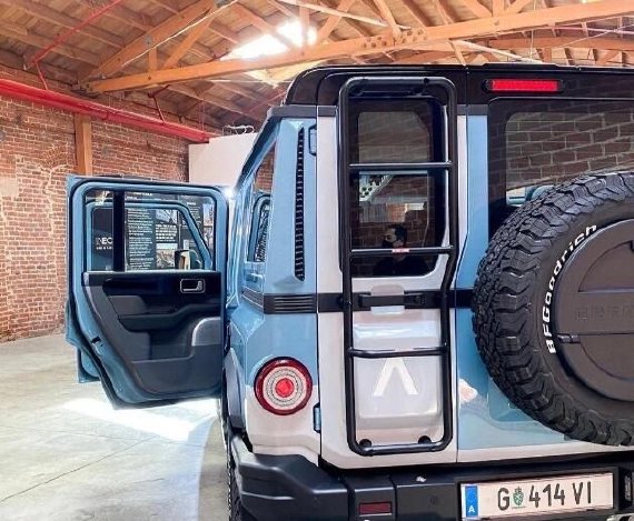 侧面造型更加方正,车门折页裸露在外,黑色饰条贯穿车门把手,轮眉采用黑色设计,尺寸很大,整车的离地间隙很高,尾部采用背负式全尺寸备胎,左侧还配备了攀爬梯子,底部依然采用左右双拖车钩,离去角度很大,整体非常硬派。