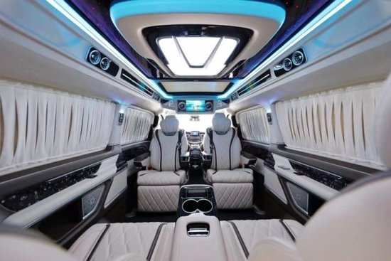 2023款奔驰V250改装商务车第二排航空座椅为带电动、加热、按摩、通风功能的航空级首长席,可沿着地面上滑轨实现一键电动式前后滑动,对于这种智能化的乘坐体验,是原厂车型笨拙的手动拖拽模式所望尘莫及的。车内的氛围灯打开后,奔驰V250内舱变得灵活多变,气氛也可以根据主灯颜色变换而变化。
