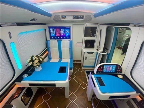 丰田考斯特改装商务车在内饰的设计上更加注重舒适和便利。内饰的设计上充分考虑了乘客的需要。丰田考斯特12座椅设计了豪华的办公桌以真皮为主。办公桌加桃木及地毯装饰。丰田考斯特改装商务车在窗帘的选择上也是别有心思。丰田考斯特改装商务车可以选择豪华的布艺窗帘或者百褶窗帘。