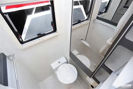 会客区对侧是厨房区,设有整体式橱柜,配备了独立水龙头、赛特福德洗菜池、嵌入式电磁炉、电源插座等,可满足日常烹饪需求;橱柜左侧还配备折叠板,增加操作台使用面积。储物方面设有组合式橱柜+厨房吊柜,可分区存放厨房物品。尾部休息区设有大尺寸横床,拓展后尺寸可达2200x1350mm,可满足多人睡眠休息;床的三面都设置了车窗,采光通风更有保障;侧面同样设有床帘,保证车内人员休息睡眠不受打扰。