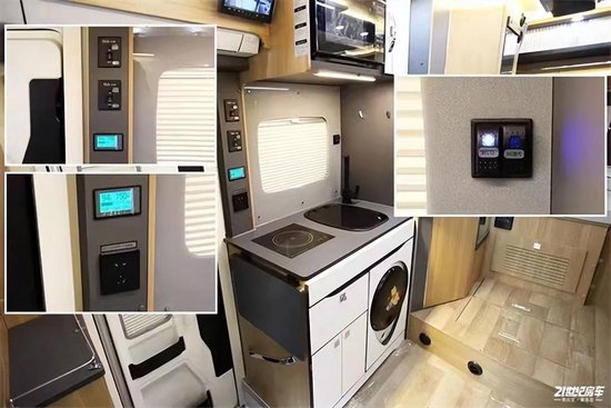 进入到室内,整体内饰风格为实用化的家具温馨风,配色上冷暖结合,追求舒适性。布局方面遵循双拓展车型的结构,尾部横床和侧拓展会客区为主,比较大的区别在于车门前置带来的整体厨房区空间。整个车辆6座3卧,承载量还是很可观的。双拓展的车型,本身空间上就大一些,因此在车内的娱乐设施方面采用了投影幕布的形式,为此还搭配了JBL音响系统,无论是坐在卡座区或是躺在尾床那里,都能得到家庭影院般的观影体验。
