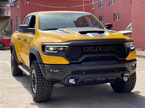 道奇Ram 1500 TRX外观方面进行了更加越野化的升级,整车采用了橙黑色的涂装,前发动机舱盖还有隆起的筋线与散热开口,前进气格栅采用黑色装饰,两侧大灯组与中网相结合形成一体式造型,前包围配备了银色的下护板以及双边拖车钩。