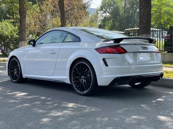 奥迪TT外观方面,整体延续了TT RS系列家族式力量型的轮廓造型。前脸熏黑的中网搭配獠牙式的LED日间行车灯,还有延续至前脸中网且有一定弧度的发动机盖板,整个前脸造型营造出一种蓄势待发的俯冲感。当然,与众不同的地方还得看黑色的品牌LOGO,它算是整个前脸的点睛之笔。
