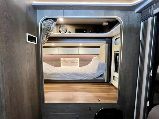 车身尾部是横置双人床,床垫采用了45D床垫,尾部拓展舱可外拓,可以让您在睡眠时享受到更加舒适的体验。前后床位私密拉帘、一键关灯、插座、吊柜、挂衣钩、穿衣镜等细节配置可以让您在后部卧室中拥有更多的私密空间和便利。 尾部卧室还配置了高回弹床垫,可以让您享受更为柔软舒服的睡眠。床铺上方设有储物空间,便于床品衣物储放。