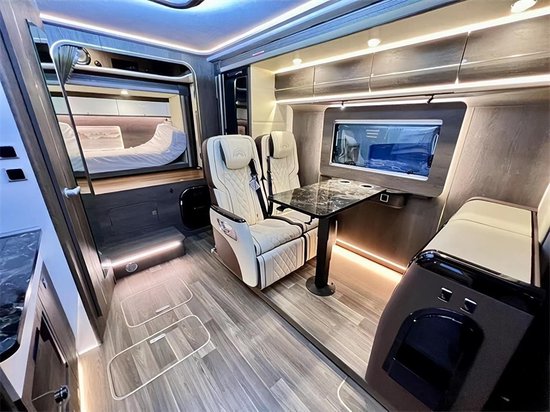 会客区右侧上方安装了9kw进口燃油大功率加热器,带有智能温控系统以及分散式散热器,可以让车内快速升温且热量分布均匀。会客区还配备了行驻车分体式空调,可以让您在旅途中享受到更加舒适的温度体验。40英寸互联网液晶电视和乘客区的4个扬声器则是为了更好地满足您对娱乐的需求。