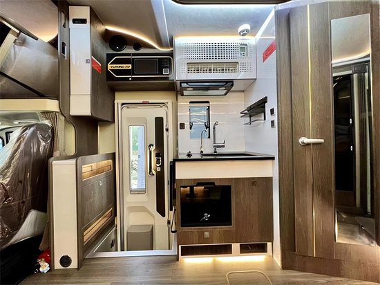 整体车身尺寸为5990*2530*3195mm,采用了五层断桥结构,铝制骨架+PVC龙骨厢体,墙体厚度48-68mm,使其更加坚固耐用,同时拥有更好的保温性。车外一体式厨房更是全新的集成化设计,包括电动遮阳棚、柴油灶、洗菜池、置物板、取水/电口,让您在户外也能轻松烹饪,享受无与伦比的方便和舒适。