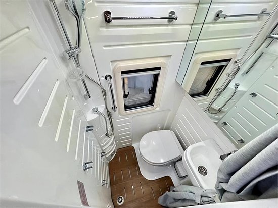卫浴区采用电动粉碎马桶、双向换气扇、淋浴花洒,毛巾杆、浴室镜、手纸盒、卫浴帘、挂衣钩、洗手盆、吊柜,晾衣绳,暖风出风口、以及进口洗衣机等基础设施,整体色调和车内保持一致,板材采用防水板材。