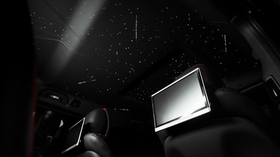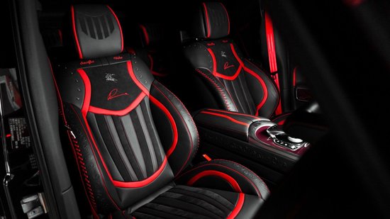 这款德国罗曼大G骑士越野SUV车内,虏曼g770豪华越野车的主题色彩鲜明而整体,善于运用“点、线、面”的形式关系,对比色的大胆运用给人以超强的视觉冲击力,从铝制踏板组,到具有真皮革包边的脚垫和行李箱垫,LUMMA风格扶手箱,车内空调出风口周边的LUMMA碳纤维,格言刺绣,NAPPA真皮座椅,Alcantara全包覆星空顶棚,一直到完成皮革涂饰,赋予作品更强的现代感和时尚感。