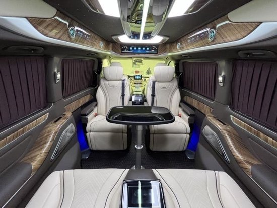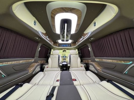 22款全新国六奔驰V250七座商务,整个车顶采用了定制的圆弧形顶灯三色可选。两侧的空调出风口全部选用了涡扇式的空调出风口,还带有出风口氛围灯设计,开启后整车的内饰风格立马不一样了360度座椅可旋转。