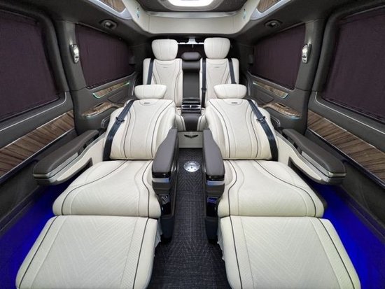 国六最新款奔驰V250七座商务浅羊绒的地毯,不仅显得更加奢华;同时还有保温降噪的作用。三排的联排座椅,可以一键放平形成一张尺寸不小的沙发床以供长途乘坐休息。七座进口商务奔驰高顶V250中东版整个车顶的选用了淡蓝色的氛围灯,和全景天窗的搭配让车内的光线在不开灯的情况下也显得非常的明亮。整个内饰选用了象牙白的内饰颜色,素雅而又高贵!