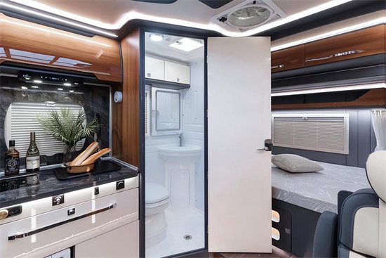 厨房区位于进门处,料理台面配备洗菜盆、电磁炉、软管式水龙头等,操作台尺寸高达630×1630(mm),另外还增加了侧方延伸板,操作空间宽裕。厨台顶部的吊柜被取消,取而代之的是一款KME 48V直流变频空调,在使用的时候需要将吊柜门打开,获得更快速的冷气流通。厨房下方集成了储物柜,便于存储调料、碗筷等琐碎物品。