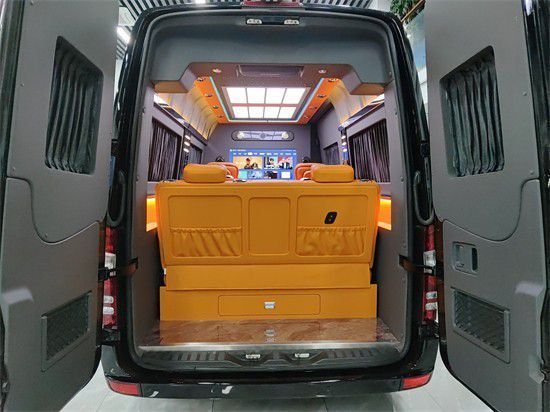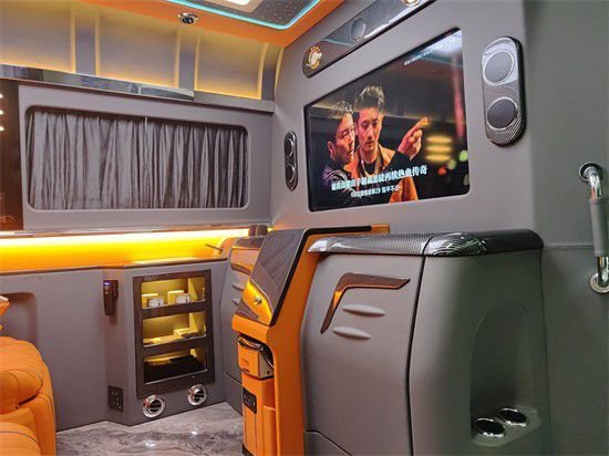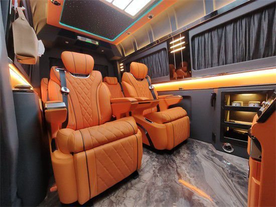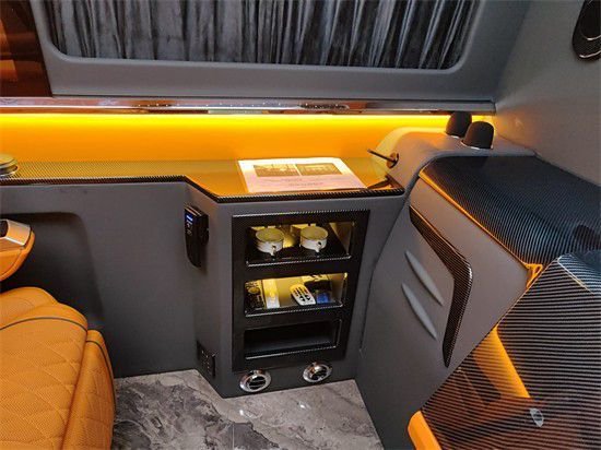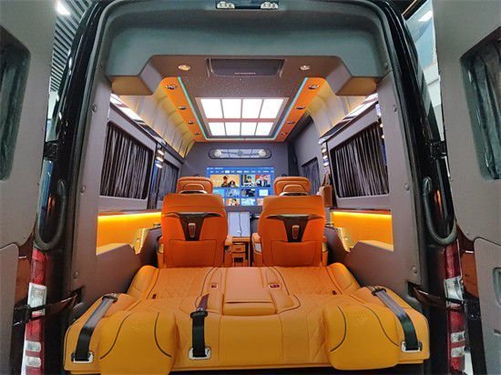 奔驰斯宾特商务版报价斯宾特,整车选用电动麂皮绒窗帘,迈巴赫宫格顶灯搭配星空顶,豪华贵气。后排沙发床放平可做休息,如果您对这款车的内饰感兴趣欢迎可以联系我们。