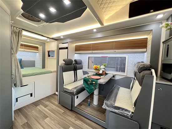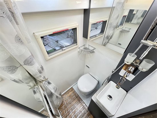 酒店式卫生间,采用电动粉碎马桶。MAXX换气扇、顶部储物柜、侧窗、独立淋浴系统,尤其是带有固定的洗漱台和洗脸盆,水电配置,300L净水箱、有着低温自动排水功能、进口驻车燃油加热器(水暖), 48V 250Ah 锂电池(12.5度电)、 48V 3500W 逆变器、1500W 的充电功率、1200W 光伏板(10块),日照比较足的地方可供使用7天以上。