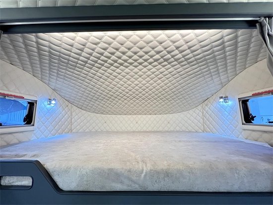 车尾主卧横置床完全拓出后尺寸更宽敞,尺寸为长2.1m 宽1.3m。轻松睡下两名成年人,两侧外推窗形成良好的空气流通循环,采光效果也更佳,顶部吊柜上安装有一圈氛围灯带,暖黄色灯源尽显温馨。水电设施方面,330L净水箱,48V 250AH电池以及48V 4000VA逆变器等,还拥有五明治保温墙体,冬季水箱保温,地暖等等亮点太多,轻松可以做到户外出行水电无忧。