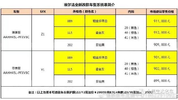 全新一代丰田埃尔法,新车共推出两款车型,售价分别为89.9万和90.9万。