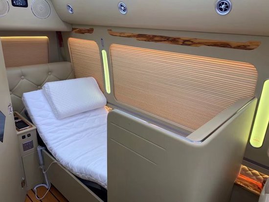 同时还首次设计了隐藏式的鞋柜和隐藏式的车载式保险柜。这辆车车厢后部还配备有车载空气净化器,以此打造出最舒适的的车内环境。 这辆车根据车载特性的需要和显示器厂家定制的前后两台LED液晶显示屏,和车厢后部公司最新研发的头等舱级电动座椅床,电动控制可变床可变座椅,以及豪华房车级卫生间的配备,带有换气扇、马桶、智能电控垃圾桶。卫生间的一侧设计了一处高尔夫设备及行李放置台,底部加高的处理和绑带的设计看上去非常高大上。