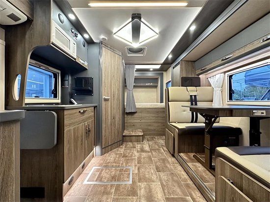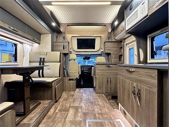 会客区采用双人对坐卡座设计,可以向外侧拓展开来,将餐桌向下可与卡座拼接变为一张1900*945(mm)的沙发床。上方设计有一组吊柜,可以放置一些物品。左侧拓展出去以后中间有了一块非常宽敞的空间。内饰采用了棕色木纹加米色木纹的装饰,沉稳内敛十分讨喜。车舱内部空间充足,大概有着2500L的超大容量。