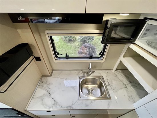 会客区采用双人对坐卡座+壁挂式折叠餐桌(桌腿可折叠)的设计,符合人体脊柱曲线设计的卡座靠背增加日常舒适性,采用一体环保成型棉,布艺+皮革面料包覆,具有高回弹,长时间使用无塌陷的效果。卡座沙发配备4个独立安全带,加之驾驶室主副驾座椅,整车核载6人。侧墙经过美化装饰,效果拔群。侧窗则带来采光及通风换气效果,日常坐在会客区还可随时观赏窗外的风景。顶部则配有吊柜及DC12V行驻车底置分体式直流变频空调。