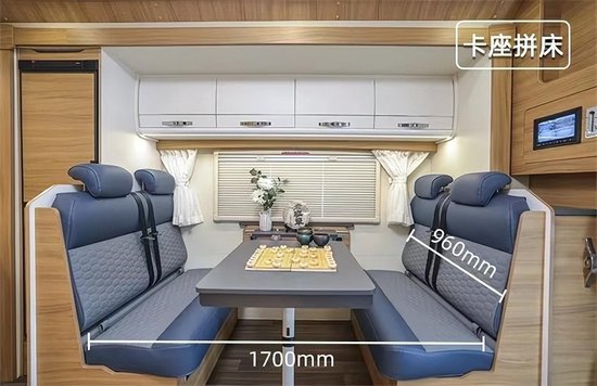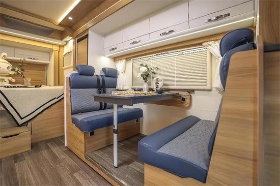 进入车内,内饰以枫棕色和米白色为主,加上顶部的环绕灯光,营造精致不失温馨的氛围。考虑到居住品质,本车采用环保轻量化板材,欧式结构及工艺制作家具,为车主带来高质量的旅居生活空间。车内布局清晰,前方为驾驶室、额头床,中部为会客区、厨房区,尾部为休息区、卫生间。