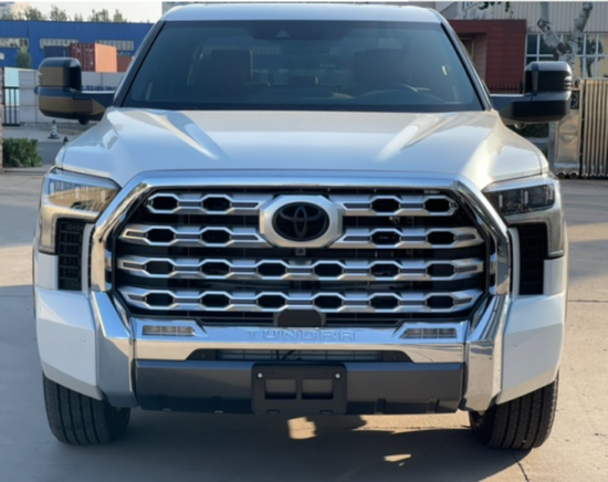 2023款丰田坦途最具辨识度的莫过于前脸这块非常大的进气中网设计,通过亚光银的饰条搭配黑色蜂窝网状的造型使得视觉上整个中网的面积似乎从车标一直拉通到前保险杠的位置上,第一感觉无疑是非常野性的。