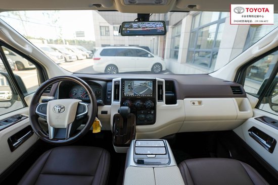 (进口)-HIACE的基础配置 2气囊,16轮,备胎,手动空调,多功能方向盘,刹车辅助系统,行车未定操控系统,汽车牵引控制系统,上坡启动辅助茅台呀警告,后雾灯,驾驶舱升级9寸导航,搭配360度全车影像,桃木方向盘,还有升级了原厂桃木纹内饰。