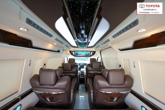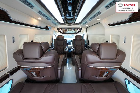 丰田(进口)海狮-HIACE驾驶舱升级9寸导航,(东方众威原创)搭配360度全车影像,桃木方向盘,升级了原厂桃木纹内饰改为进口豪华感顿显。(东方众威原创)主副驾驶座椅真皮包覆,主副驾驶座椅四向电动调节带通风加热,(东方众威原创)主副驾驶中间升级车载扶手冰箱。丰田(进口)海狮-HIACE主副驾驶后面,加装了24寸高清液晶电视娱乐系统,全车升级阿尔派音响系统。