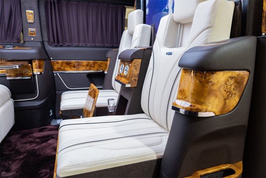 克蒂圣姆峰商务车正副驾驶座椅均配备十项电动调节,BV元素真皮加上稀有雀眼木装饰。