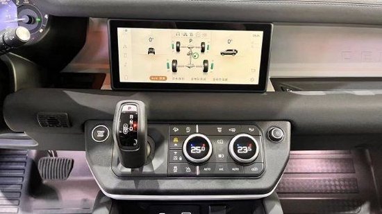 路虎卫士内饰设计变得不再简陋,中控台使用了涂层镁合金材质,进一步提升了内饰的耐用性,新车使用了全新的四辐式方向盘、12.3英寸全液晶仪表、10英寸中控屏幕,空调旋钮带有液晶显示屏,电子挡把位于中控屏下方,使用更加顺手。